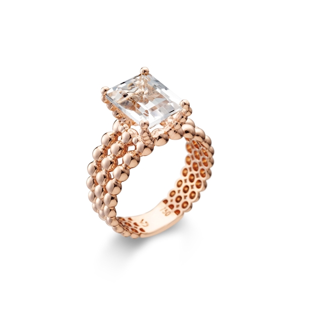 O Anel Aninha combina o brilho elegante da topázio incolor com a textura icônica da marca. Seu aro em esferas de ouro 18K sustenta a pedra central com leveza e proporção, resultando em uma joia de presença delicada e desenho atemporal — perfeita para compor diferentes estilos.