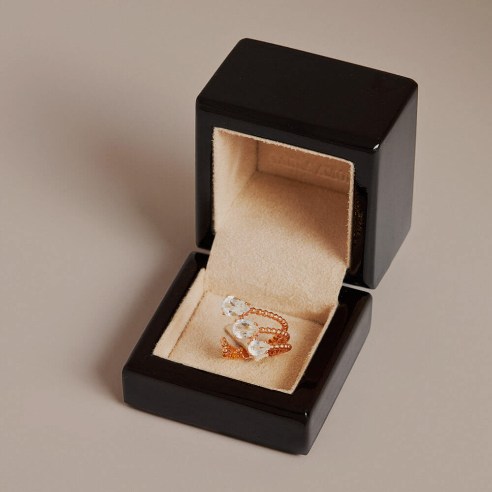 Inspirado na fluidez e leveza da natureza, o Anel Caminho das Águas traz o movimento das ondas em uma composição delicada de ouro e topázios incolores. As gemas em corte gota representam gotas d’água, criando um efeito de brilho contínuo que reflete o equilíbrio entre forma e movimento — uma assinatura do design Carla Amorim.