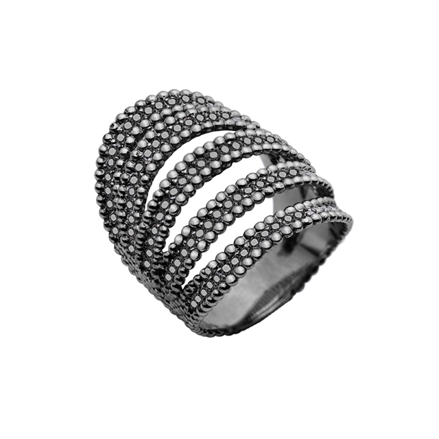 O Anel Chafariz é parte da coleção Rússia. O anel possuí a textura de espuma do mar e é cravejado de brilhantes negros, um must have!