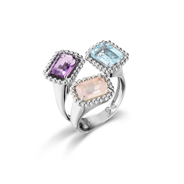 Anel em ouro 18K branco com ametista, quartzo rosa, topázio Sky