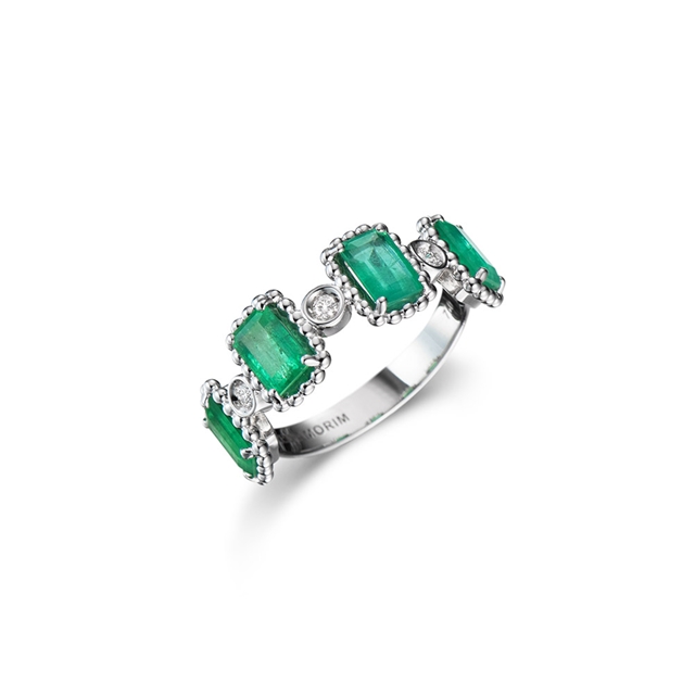 Anel em ouro 18K branco com esmeralda e brilhantes.