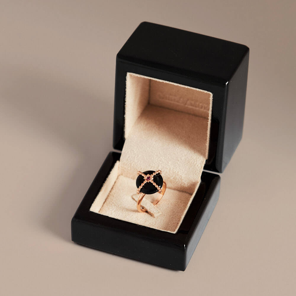 O Anel Conexão pertence à coleção Florescer. Inspirado na força e no equilíbrio das formas da natureza, combina o brilho intenso dos rubis com a profundidade da ágata negra em composição harmônica e sofisticada.