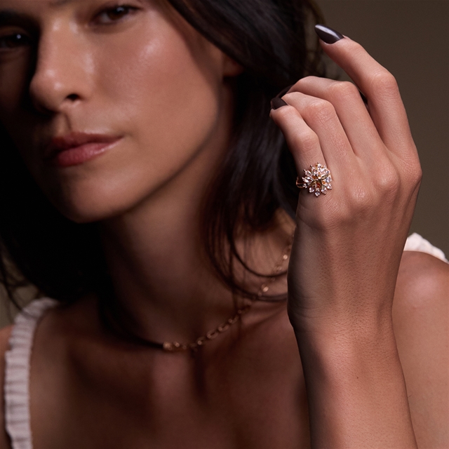 Em ouro 18k com topázios, o Anel Divino Espírito Santo Iluminado Petit traduz a luz desse símbolo eterno em uma forma delicada. A peça une fé e design com suavidade, criando um brilho sutil que acompanha com significado e elegância.