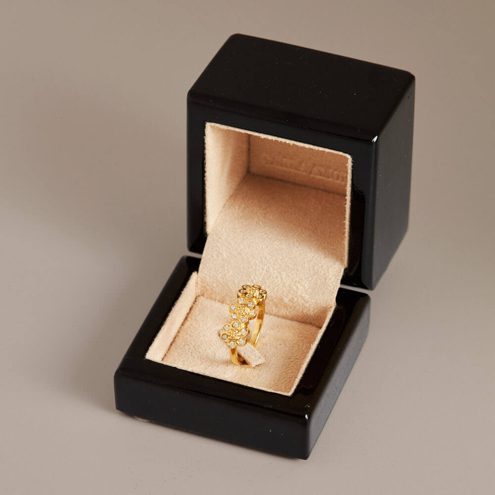 O Anel Margarida celebra a beleza das formas naturais em uma composição delicada e luminosa. As pequenas flores em ouro 18K com diamantes remetem à pureza e à simplicidade da natureza, refletindo o equilíbrio entre movimento, textura e luz — traços marcantes do design brasileiro.