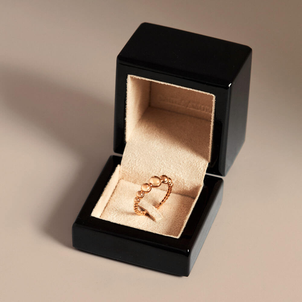 O Anel Noronha apresenta o design de esferas em sequência contínua, marca registrada do estilo Carla Amorim. A construção precisa em ouro maciço revela o equilíbrio entre leveza visual e força escultórica.