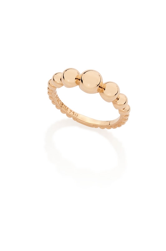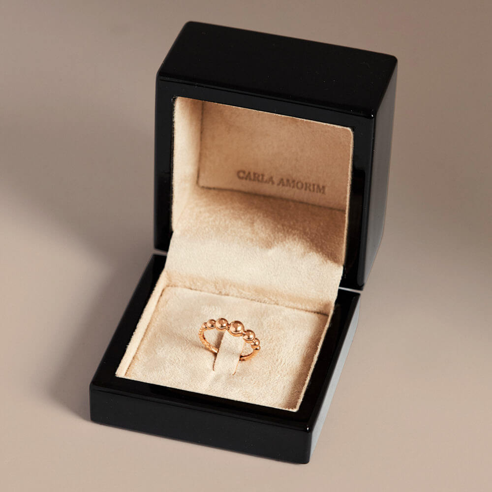 O Anel Noronha apresenta o design de esferas em sequência contínua, marca registrada do estilo Carla Amorim. A construção precisa em ouro maciço revela o equilíbrio entre leveza visual e força escultórica.