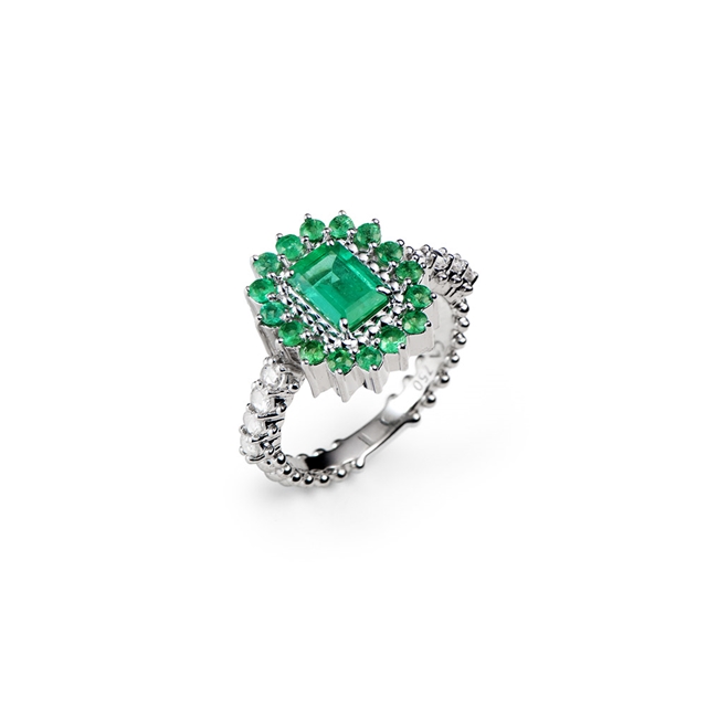 Anel em ouro 18K branco com esmeralda e diamantes.