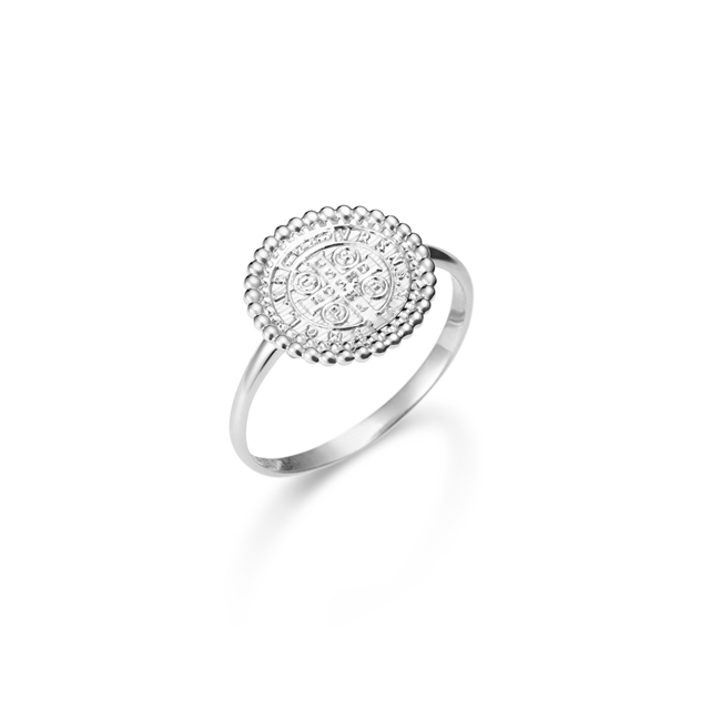 O anel São Bento faz parte da coleção Sagrado. Carla faz referência a lembrança de onde encontramos a paz, o refúgio, a luz que nos guia, a fortaleza o socorro e a proteção.