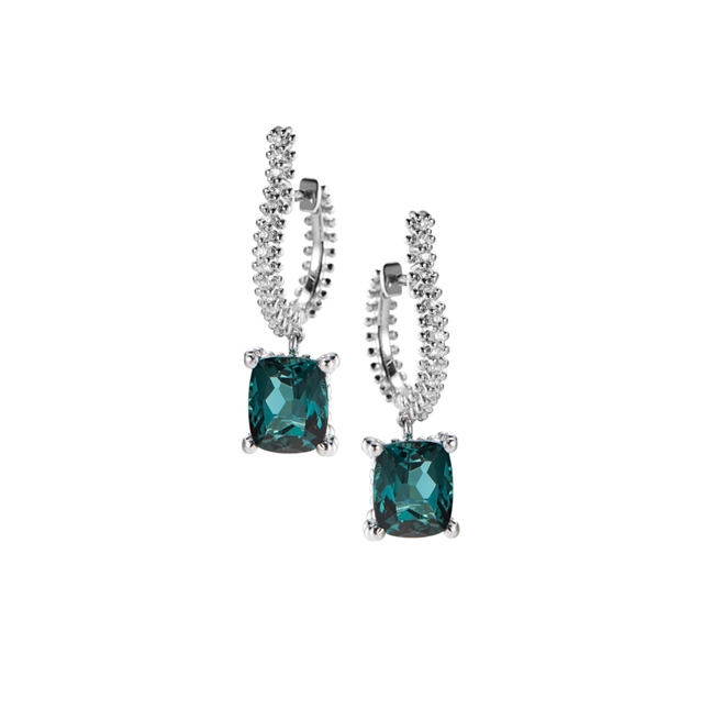 Argola em ouro 18K branco com turmalina azul e brilhantes.