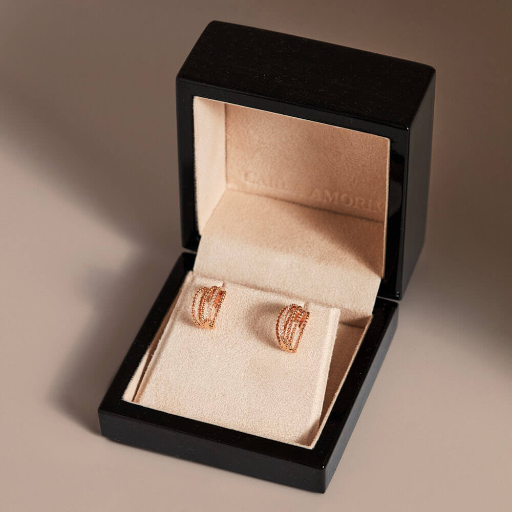 Ouro rosa 18K com diamantes naturais certificados pelo Processo de Kimberley.