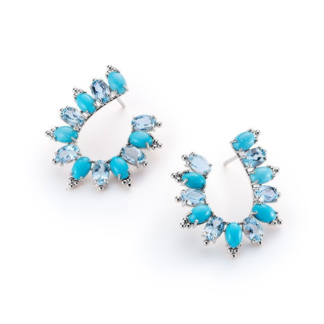 Os brincos Céu da Manhã fazem parte da coleção Caminho das Águas. As pedras azuis celebram as tonalidades do céu que se refletem sobre a superfície tranquila das águas, enquanto a lapidação em forma de gota captura esse instante em que luz e cor se encontram. Em ouro 18K, turquesa cabochon e topázio azul, revelam uma delicadeza luminosa que parece suspensa entre céu e correnteza.