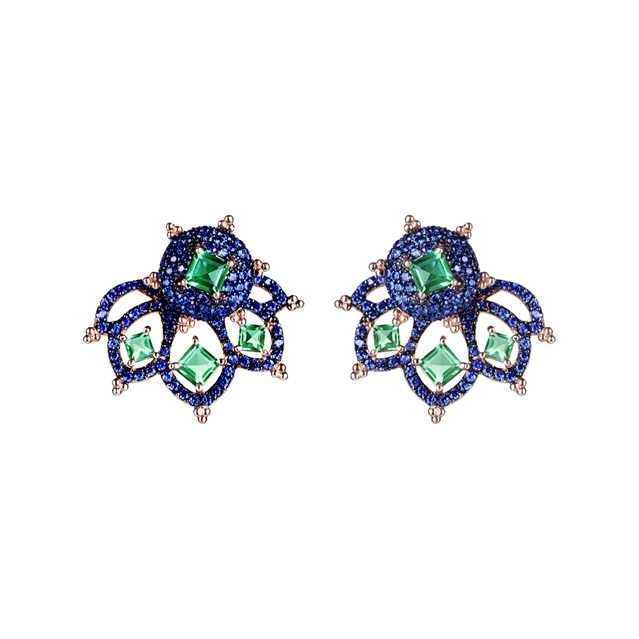 Peça em ouro 18K rosa com esmeralda e safira azul.