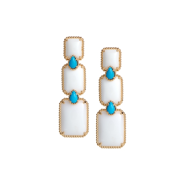 Os brincos Espelho da Alma fazem parte da coleção Florescer. A arquitetura e a joalheria se encontram em formas geométricas que simbolizam a conexão entre tudo ao nosso redor. A proporção crescente da ágata representa evolução e reflete a construção de quem a usa. O contraste entre a ágata branca e a turquesa ilumina o desenho em ouro 18K com suavidade e presença.