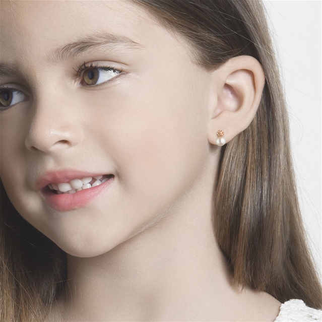 O brinco Floquinho de Neve é uma linda opão de presente para crianças pequenas e meninas descoladas. Peça em ouro 18K rosa com pérola.
