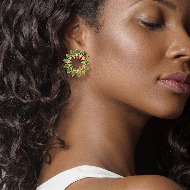 Os brincos Praia do Espelho fazem parte da coleção Oceamo. A peça nasce da contemplação do mar, inspirada nas texturas da espuma, nas nuances das águas e no movimento contínuo das ondas que sempre guiaram o olhar criativo de Carla. A combinação entre jade nefrita, peridoto e esmeralda traz profundidade e frescor ao desenho, revelando uma joia que reflete a poesia luminosa do oceano.