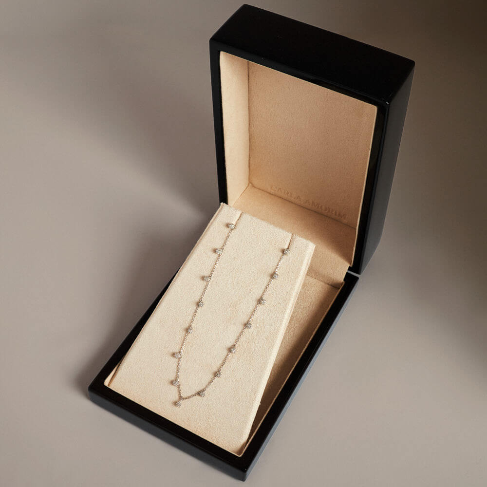 O Colar Amorinhas é uma delicada sequência de pequenas esferas em ouro 18K que refletem luz e afeto. Sua silhueta leve e versátil faz dele uma peça essencial, ideal para o uso diário ou para composições com outras joias da marca.