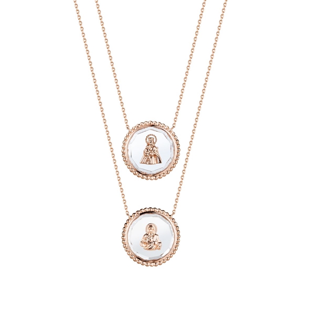 Escapulário em ouro 18K rosa com quartzo incolor.