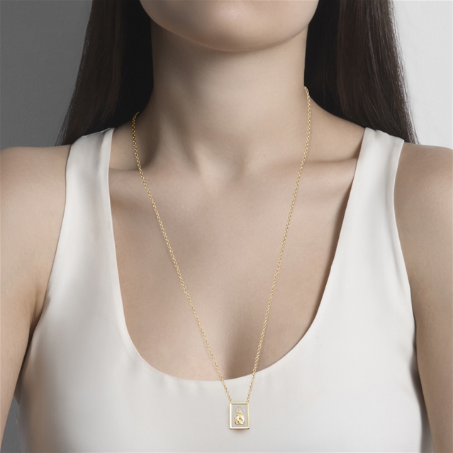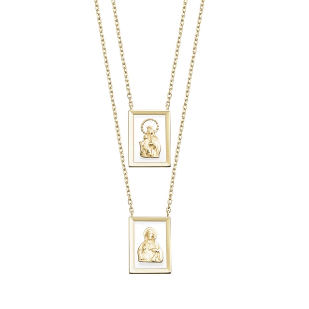 O Escapulário Proteção Retangular faz parte da coleção Sagrado. Uma peça belíssima com os ícones religiosos em ouro 18K aplicados no Quartzo incolor.