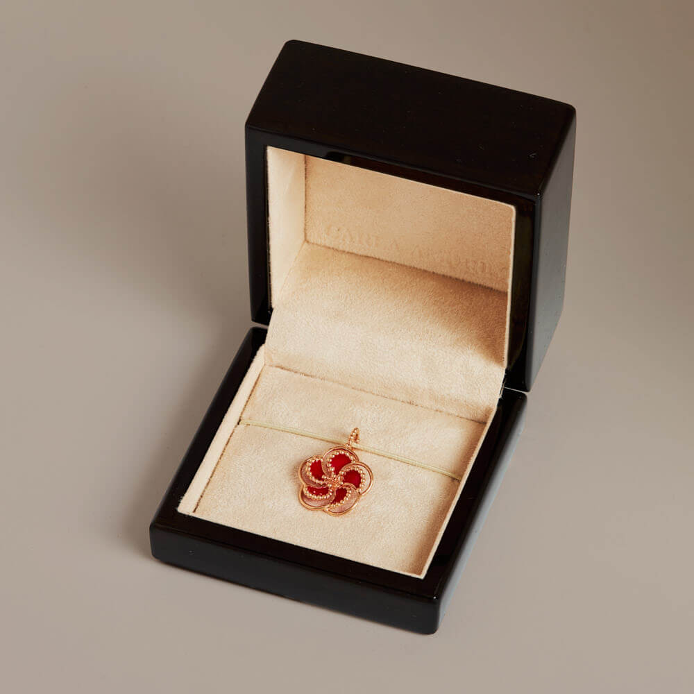 O Pingente Amor Perfeito pertence à coleção Florescer. Inspirado na flor que simboliza amor e lembrança, representa a delicadeza dos sentimentos que permanecem no tempo. O esmalte vermelho realça o contorno das formas e intensifica o contraste com o ouro.