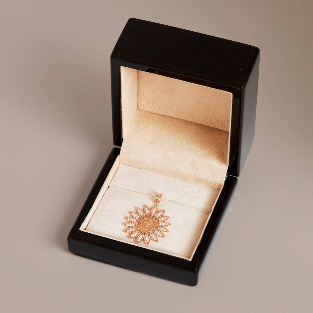 O Pingente Chama de Amor traz a imagem de Nossa Senhora das Graças envolvida pelo icônico trabalho Chama, já presente no DNA da marca. Uma joia que representa o amor e as bênçãos que acompanham a mulher em todos os momentos do seu dia.