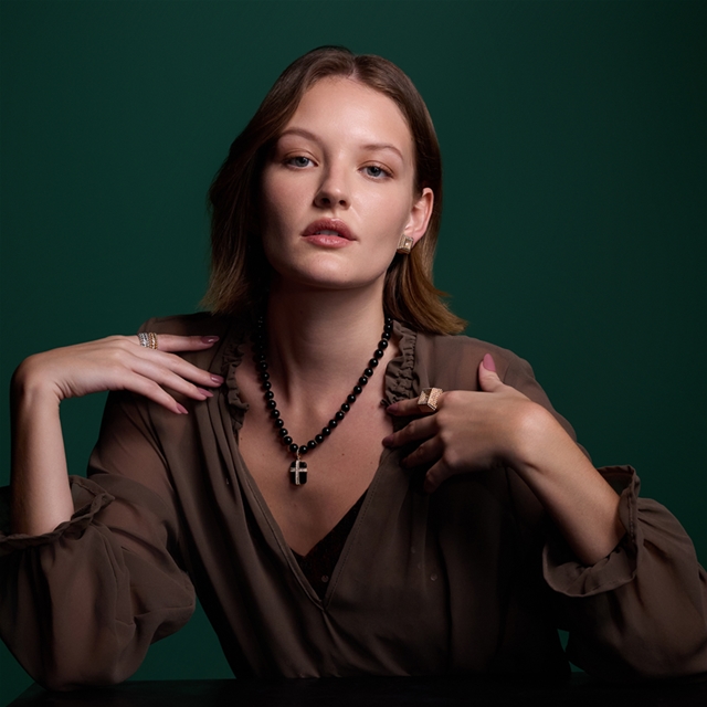 O pavê central de diamantes ilumina a cruz, enquanto o ônix acrescenta contraste e profundidade.