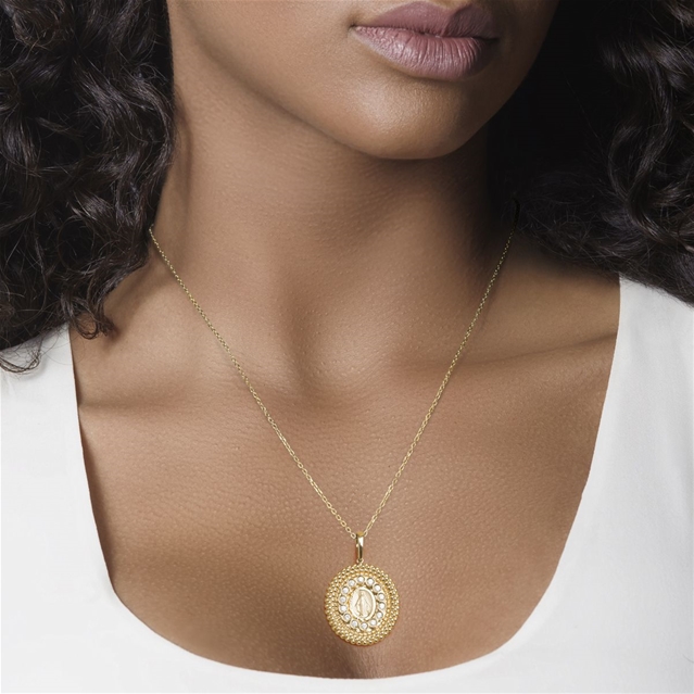 O pingente Nossa Senhora é uma linda homenagem a Nossa Senhora com uma moldura inteira da textura de espuma do mar, um clássico da coleção Sagrado.