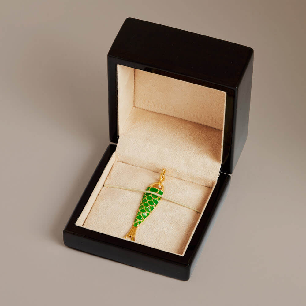 O Pingente Peixe Esmalte Verde celebra o movimento das águas e o ciclo da vida, tema recorrente no universo criativo de Carla Amorim. Em ouro 18K, com esmaltação verde intensa e diamantes sutis, a joia reflete o equilíbrio entre natureza e elegância, em um desenho orgânico e sofisticado.