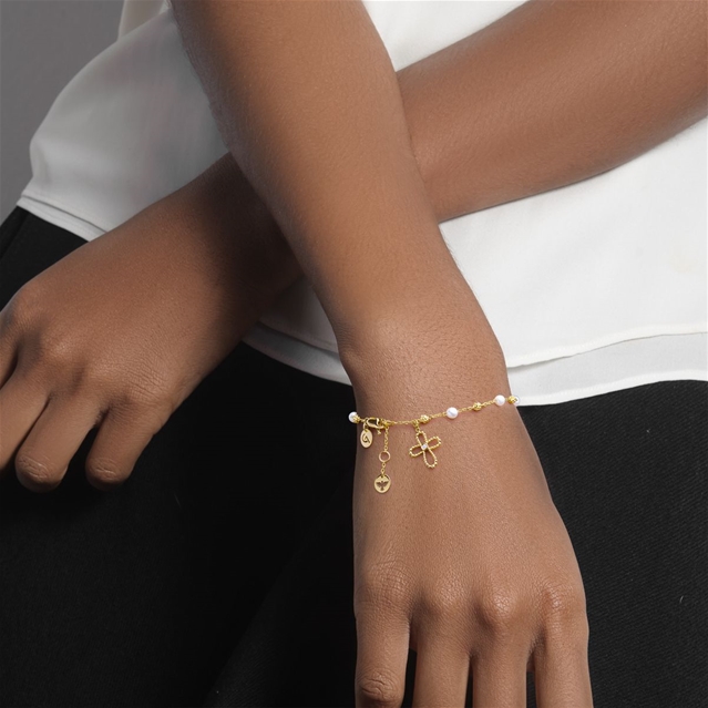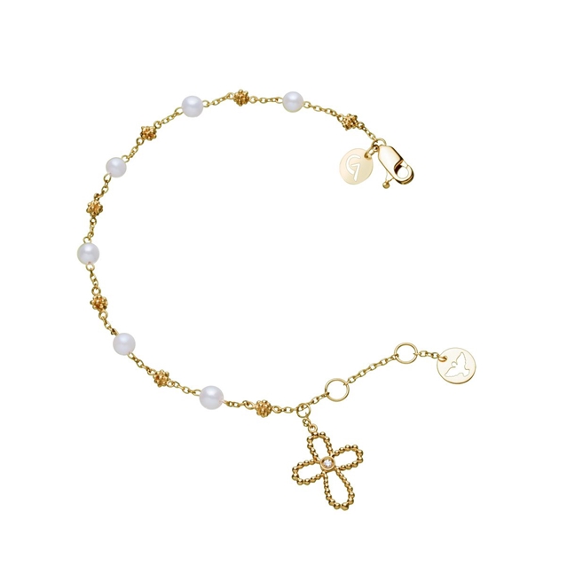A pulseira Caminho da Cruz faz parte da coleção Sagrado. Simbólica, a peça não deixa nada a desejar com suas pérolas e cruz.