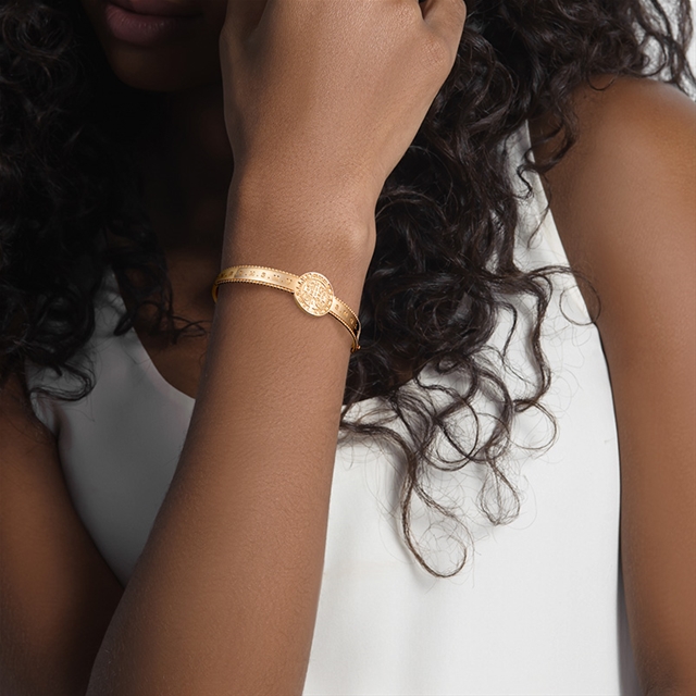 A pulseira São Bento faz parte da coleção Sagrado. Carla faz referência a lembrança de onde encontramos a paz, o refúgio, a luz que nos guia, a fortaleza o socorro e a proteção.