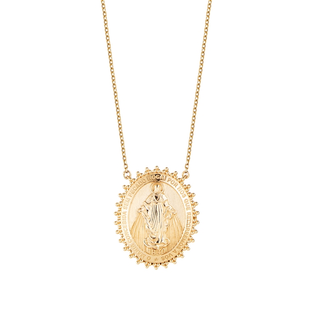 O Relicário Nossa Senhora das Graças faz parte da coleção Sagrado. Carla faz referência a lembrança de onde encontramos a paz, o refúgio, a luz que nos guia, a fortaleza o socorro e a proteção.
